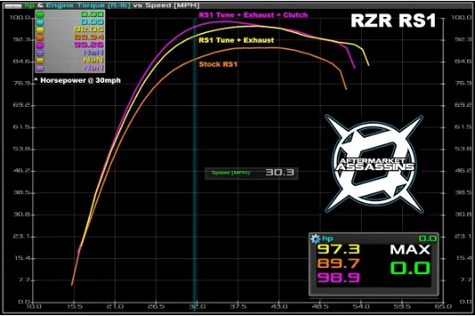 - Lock and load your RZR RS1 and get ready for some serious kick! The RZR RS1 is a great machine, but Polaris left a ton of room for improvement on any year machine. This simple kit is the best way to wake up your RS1 as it comes with our proven ECU tunes which are loaded via the PV3 ECU tuner. The tunes add some amazing horsepower from low-end to high-end RPMs and really give your machine that “snap” you’re looking for. The clutching compliment the tuning perfectly by better transferring the power to the wheels and ridding yourself of the very lazy factory clutching setup.
