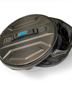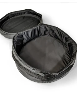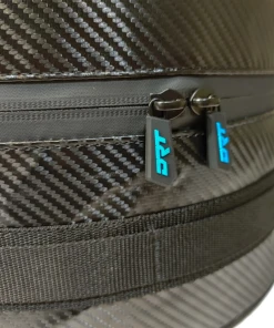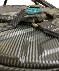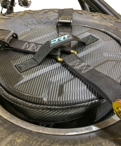 When used with DRT Tire Carrier/Adventure Rack the wheel is turned upside down to expose the wheel cylinder, and the bag is placed inside and held in place with the “Y” strap. This bag features a carbon fiber vinyl top with a durable nylon body to withstand the harsh elements of road adventures.