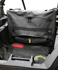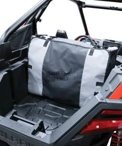 The Nelson Rigg Hurricane Waterproof UTV Cargo Bag fits in most sport and utility UTV’s. Made from a 100% waterproof, UV-coated tarpaulin PVC featuring electronically heat welded seams, this bag keeps your contents dry and free from dust. A front utility panel houses three inner mesh pockets for quick access items and covers the heavy-duty zippers on the bag. Inside, two compartments convert to one by removing a divider. Three removable interior panels allow the bag to conform to tight spaces and hold its shape while empty.