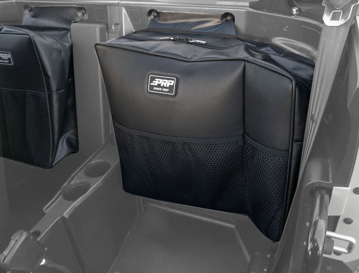 PRP’s Firewall Bags for the Kawasaki KRX provides a ton of much-needed storage for your UTV. The large storage compartment is perfect for spare parts, tools, jackets, spare rags, and extra water bottles! Both bags are designed to fit behind the seats, and attach to the firewall in the stock screw locations (we provide new hardware). Each bag has a large opening on top that features our quiet, rubberized PRP zippers to reduce noise. This makes it easy to access your stuff while standing next to the vehicle, or while seated and reaching behind the opposite seat. The bag is also designed with a low profile so that it does not interfere with the Kawasaki Click-6 Harness bar or most other aftermarket harness bars.